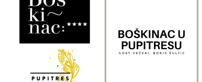 21/11/2020 @ 18:30 – 20:30 – Velika nam je radost i veselje najaviti vam gostovanje vinarije Boškinac u Pupitresu. U goste nam stiže Boris Šuljić. Bit će to jedinstvena, nezaboravna, opuštajuća i vrlo posebna večer u Pupitresu. Neizmjerno se veselimo dolasku Borisa Šuljića u Pupitres. Veliki i poseban čovjek. Vlasnik boutique hotela i restorana s Michelinovom zvjezdicom te vinarije Boškinac. Oh, […]