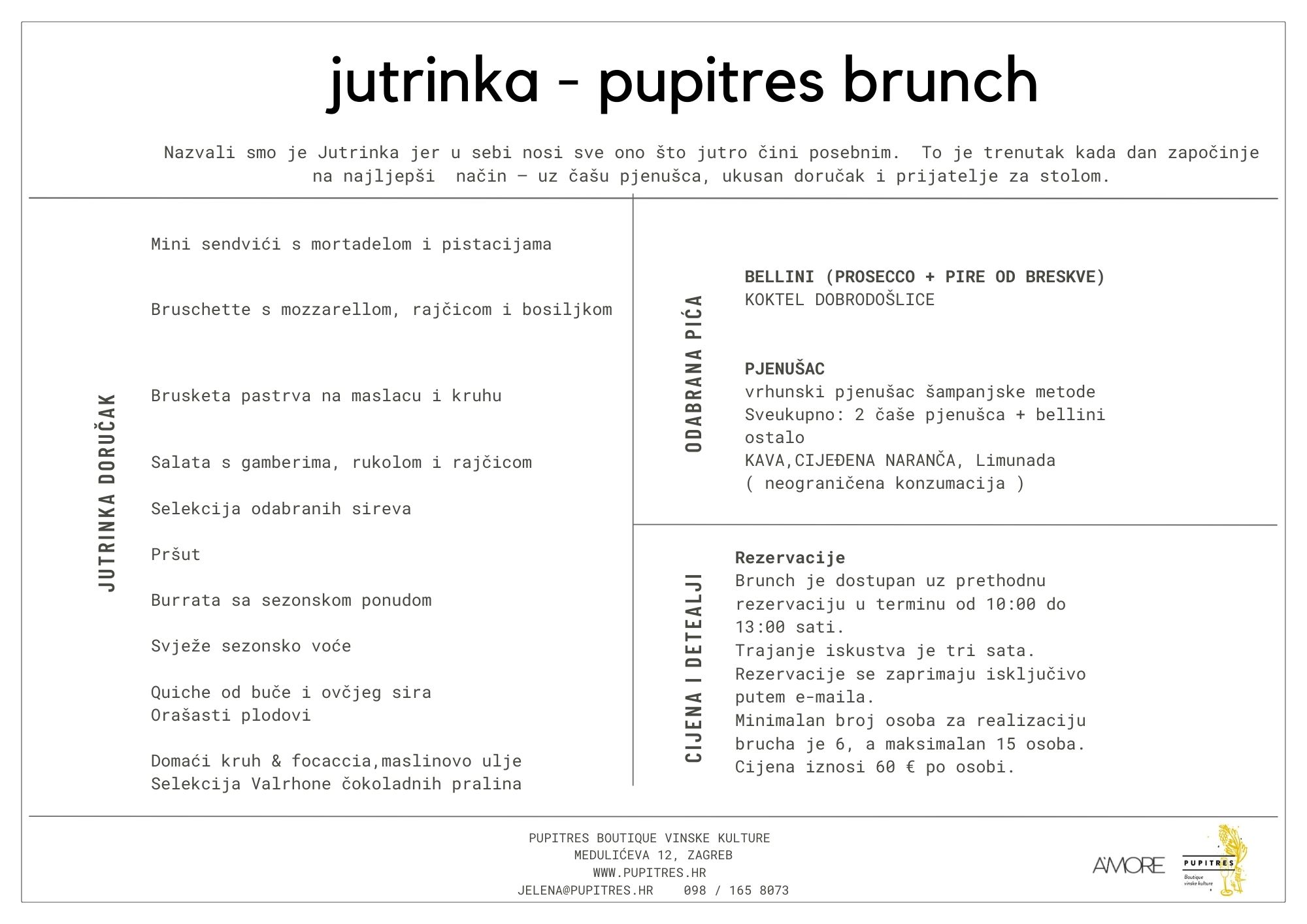 Jutrinka je zamišljena kao toplo, iskreno druženje: tri sata uživanja uz pjenušce, bellini, kave i ostala pića te bogat doručak.
