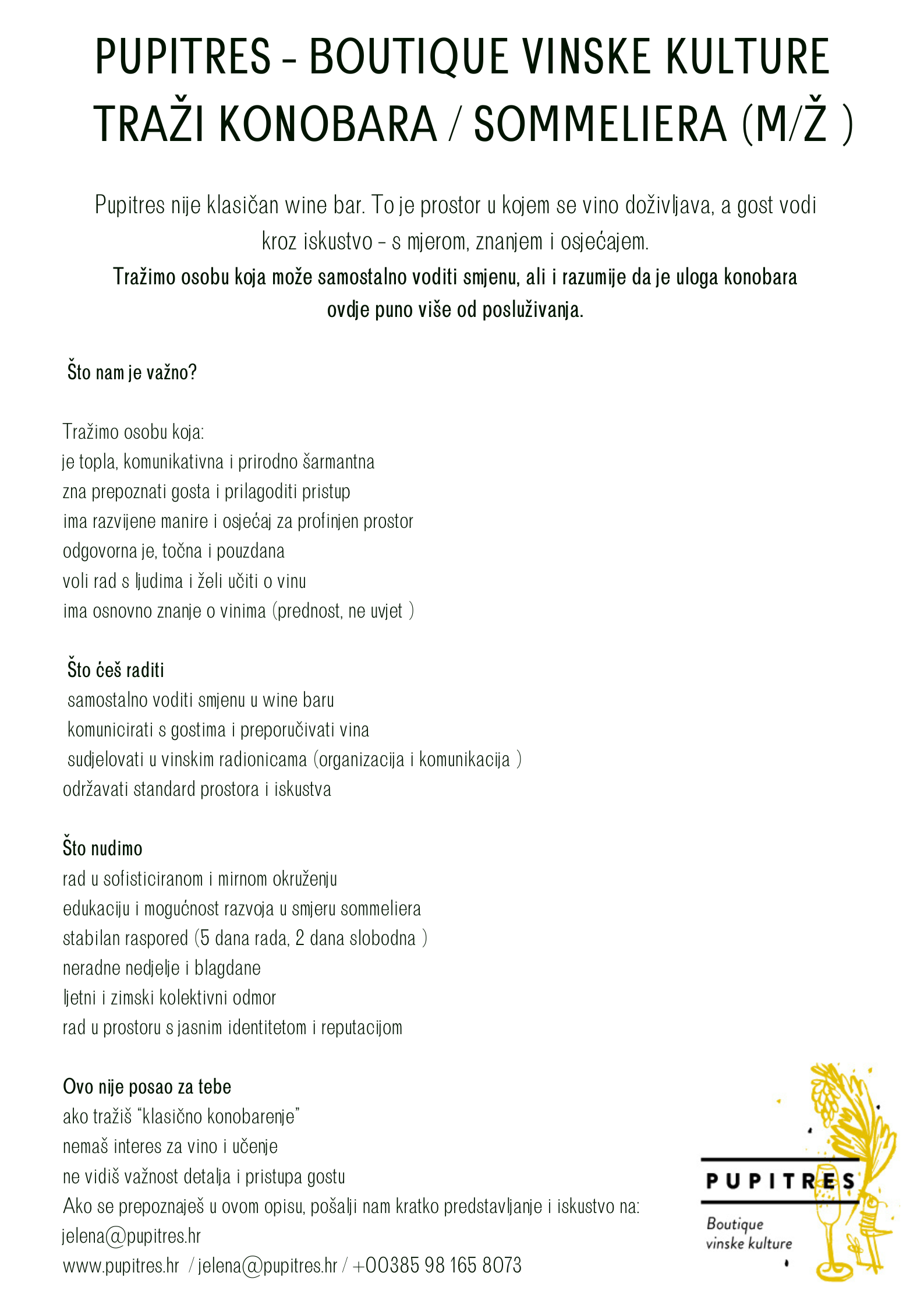 Pupitres, Vaša oaza radosti. Želite li kušati neka od najposebnijih vina, večeri provoditi uz vrhunsko vino, ukusne birane sireve, pršut i bruskete uz predivnu glazbu? Želite naučiti više o vinu i vinskoj kulturi te upoznati ljude s kojima dijelite zajedničku strast prema vinu? U tom slučaju upravo će PUPITRES BAR sommelierke i edukatorice Jelene Šimić Valentić biti idealno mjesto za vas! Rezervirajte Vaš stol na: jelena@pupitres.hr